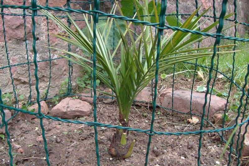 so sieht jetzt mein 9-jähriger Jubaea-Sämling aus,der seit 4 Jahren ausgepflanzt ist.Ich hab jetzt mal die Wedel von anno dunnemal abgeschnitten.Vielleicht gehts ja nun mal mit dem Wachstum endlich voran.Aber ich kann auch nur bestätigen:Die Sämlinge wachsen am besten bei gleichmäßiger Wärme(20-25°C)im Halbschatten oder auch sehr gut im Zimmer am Nord/Ost Fenster.