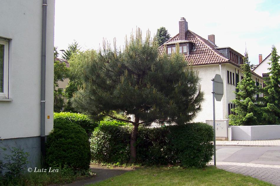 auch eine Mittelmeer-Pinie 'Pinus pinea' entdeckte ich heute noch in Neu-Isenburg, in der Hugenotten-Alle/Ecke Schopenhauerstraße. Seit gut 20 Jahren soll jene dort an der Ecke des Hauses im Garten gedeihen. Wie mir die Besitzerin, eine nette ältere Dame erzählte, hat sie die Pinie damals als sehr kleine Jungpflanze in einem Lebensmittelmarkt am Obststand zur Weihnachtszeit gekauft (kenne ich-gibt es oft als Dekopflanze im Dezember, oft mit Schneeschaum überzuckert-dann aber leider nicht mehr zu gebrauchen!) und im Folgefrühjahr im Garten ausgepflanzt.