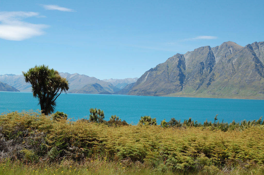 Massenbestand des südlichen Adlerfarns /*Pteridium esculentum*/ der teilweise bis zu 4m hoch wird vor der Kulisse eines türkisblauen Bergsees