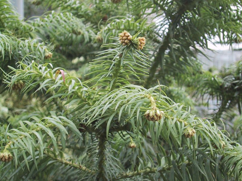 selten zu sehen: die weibl.Blüten der chin. Sicheltanne (beobachtet im Palmengarten Frankfurt)