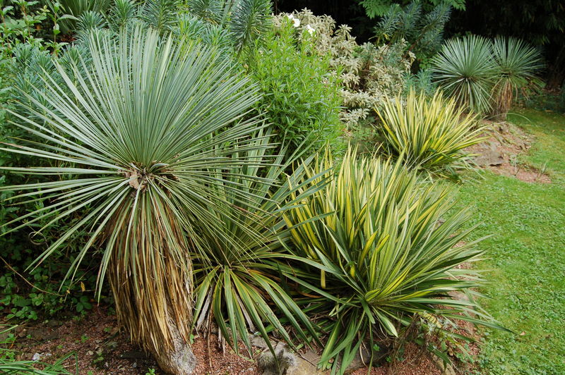 im Exotengarten wirken besonders die buntlaubigen Yuccas (hier: /*Yucca filamentosa variegata*/vorne re) im Zusammenklang mit Bambus,Acer u.Yucca-Wildformen
