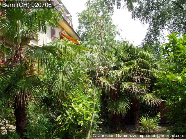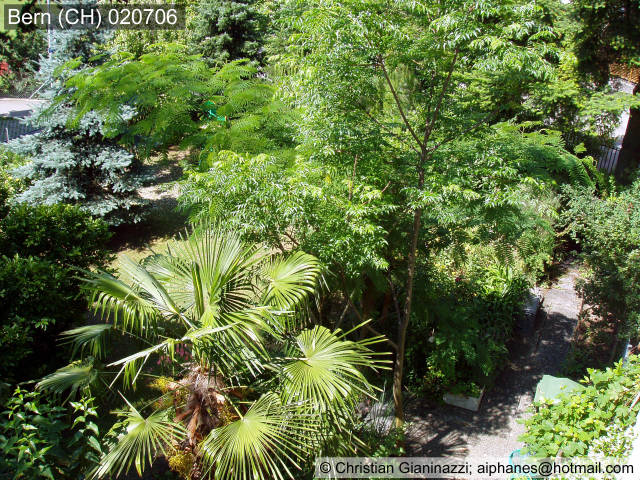 Hier ein Teil des Gartens von oben betrachtet; der Baum neben der Trachycarpus ist eine Melia azaderach, die bereits verblüht ist. Links daneben ist das gefiederte Laub einer Albizzia zu erkennen.
