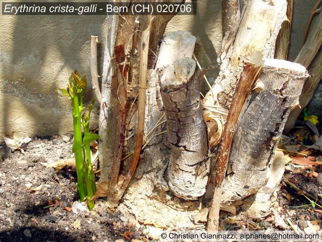Auch E. crista-galli ist gut winterhart (direkt an der Hauswand), und treibt seit 7 Jahren jedes Jahr zuverlässig wieder aus; die Triebe werden bis zu knapp 3m hoch, und wie man an den erfrorenen Vorjahrestrieben erkennen kann, auch ziemlich dick. Leider noch keine Blüte!