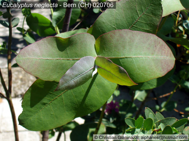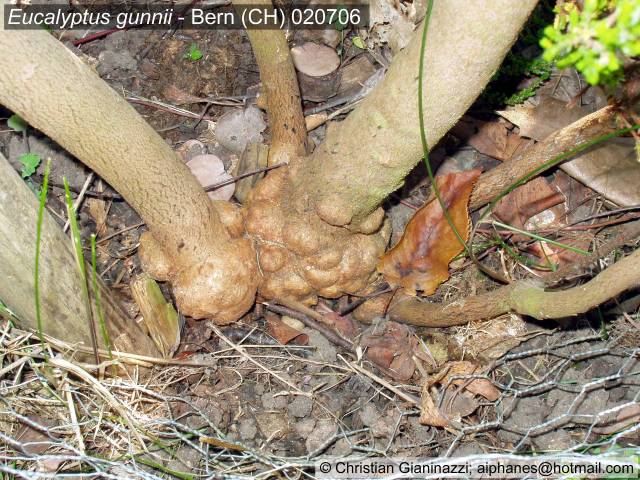Und nun zu den Eucalypten: Dieser E. gunnii wächst in sehr„schlechtem“ Boden: sehr trocken im Sommer, darunter liegt Bauschutt; ev. ist die ausgeprägte Lignotuber-Bildung („Knolle“ über dem Boden) darauf zurückzuführen.