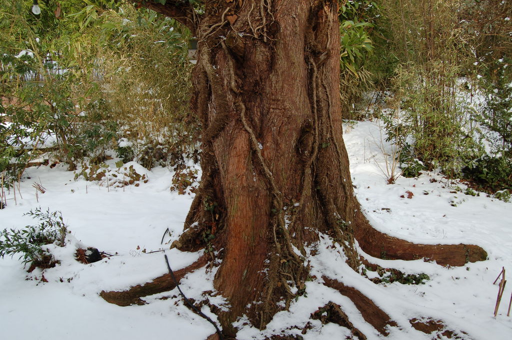 /*Metasequoia glyptostroboides*/ macht v.a. durch ihre rötliche Rinde im Winter eine besonders gute Figur