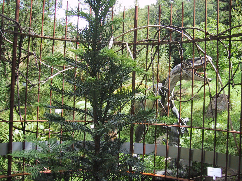 /*Wollemia nobilis*/ mit Schutzgitter eingepfercht, damit der Velociraptor-Raubsaurier nicht seine Hacken-Krallen abwetzen kann