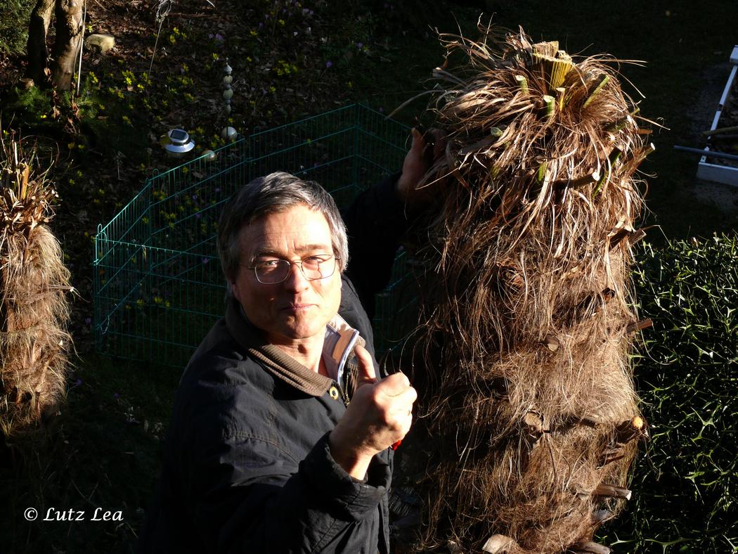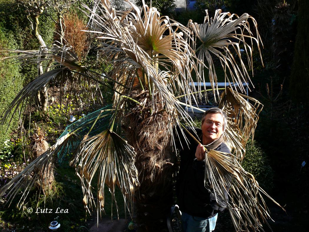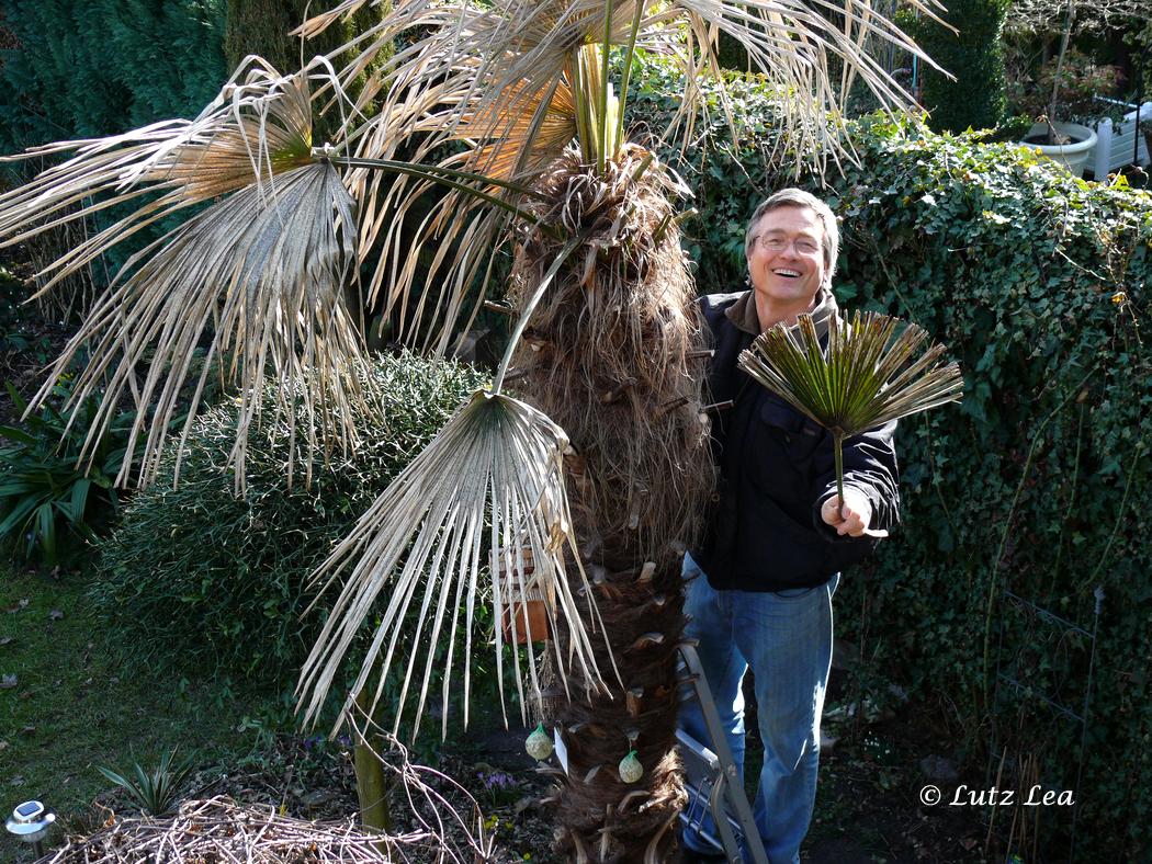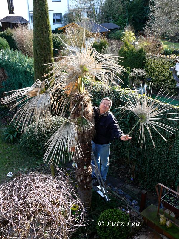 heute Nachmittag habe ich nicht lange gefackelt und die völlig verfrorenen Trachyblätter bei allen Exemplaren in unserem Garten abgeschnitten. Ich fahre volles Risiko und bleibe dem Motto treu - Freilandpalme soll Freilandpalme bleiben - Blattverluste sind immer wieder drin und bei dieser "Offenhaltung" leider nicht zu ändern.
