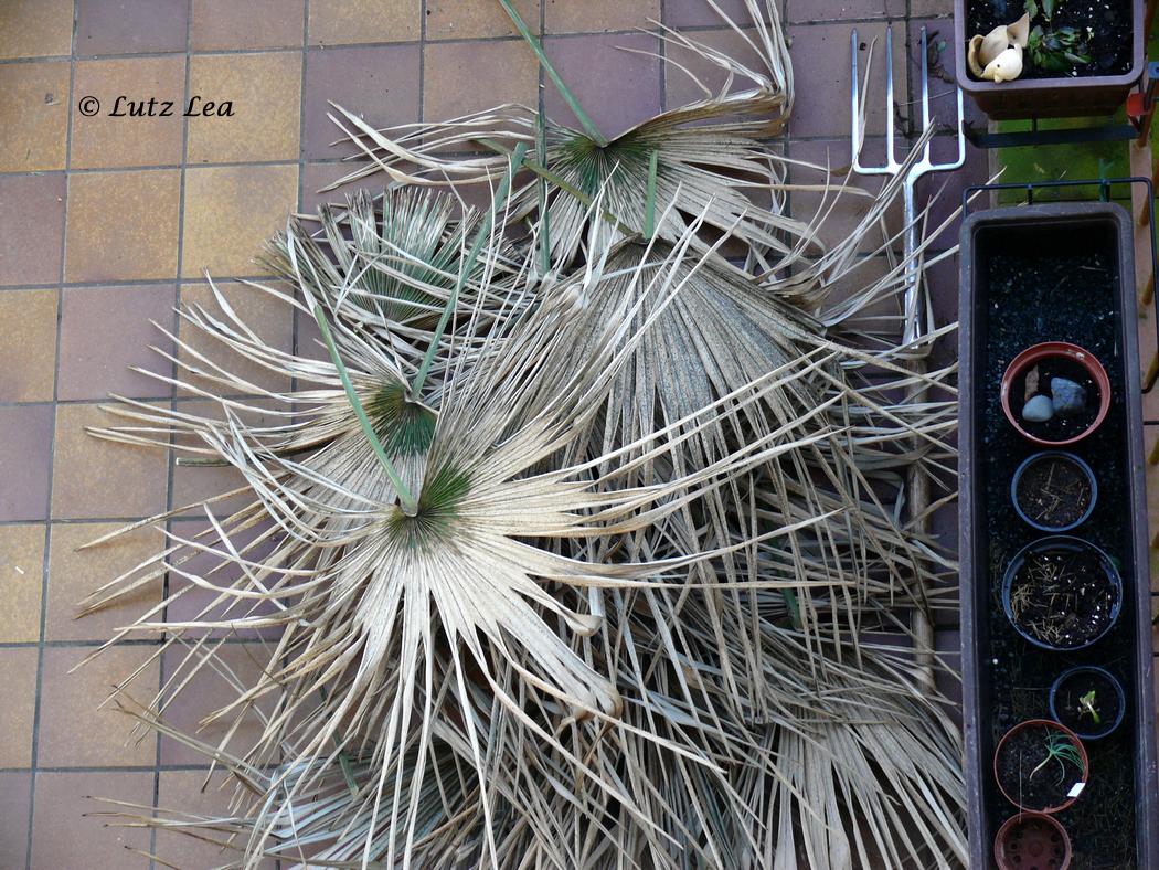 Die -17,7°C am 20.12.2009 waren einfach zu viel des "Guten" - der Grenzwert von -15°C wurde deutlich unterschritten. Es zeigt sich immer wieder was eine Extremnacht ausmacht - egal, ist halt wieder passiert - nur leider zum zweiten Mal - schon nach -18,2°C am 7.01.2009 killte der Frost das gesamte Fächerwerk. Zum Glück schob der Trachy insgesamt 16 neue Blätter bis zum Spätherbst 2009.