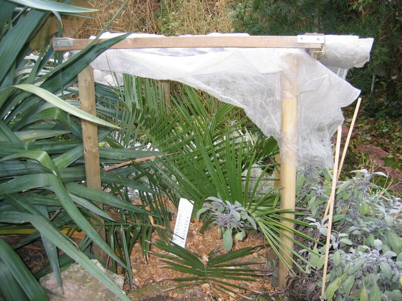 Bild 9 unter diesem Fließhut steckt eine kleine Washingtonia robusta ( 30 cm Stamm)- eher Stämmchen, wurde erst im April ausgepflanzt- soll aber bei Bedarf noch wesentlich besser geschützt werden- ist erstmal mehr ein Provisorium gegen zuviel Feuchtigkeit