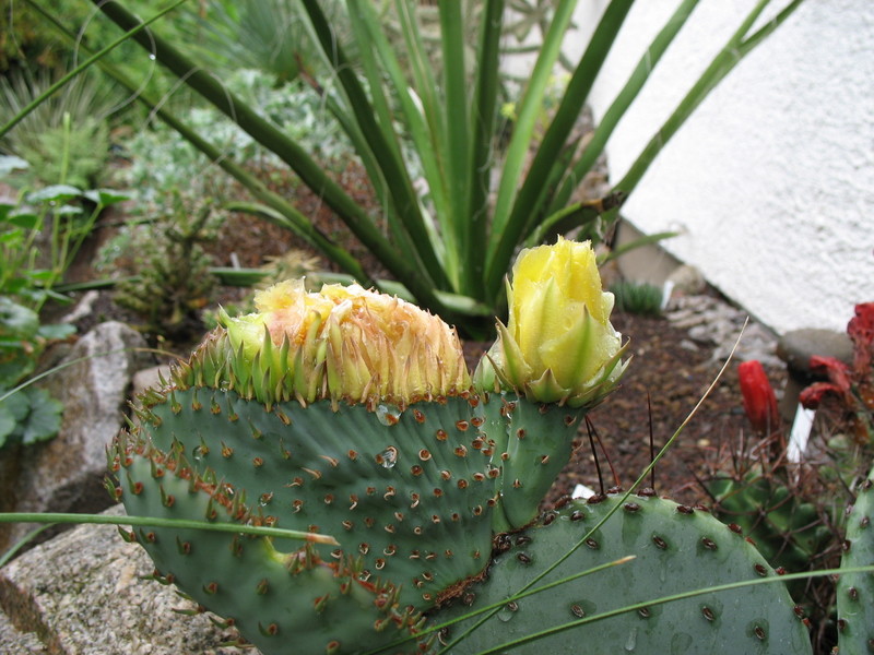 wenn Opuntien im Frühjahr knospen, bilden sich entweder neue Glieder oder Blüten. Bei einem Trieb meiner /*Opuntia macrocentra*/ wußte man anfangs nicht was das werden sollte. Dann entwickelte sich doch ein, etwas unförmiges, "Ohr" und nun blüht es auch noch bandförmig. Leider öffnen sich die Blüten bei diesem Dauerregen nicht. Ich weiss nicht ob derartige Erscheinungen häufig sind, bei mir im Garten sehe ich es zum ersten Mal.