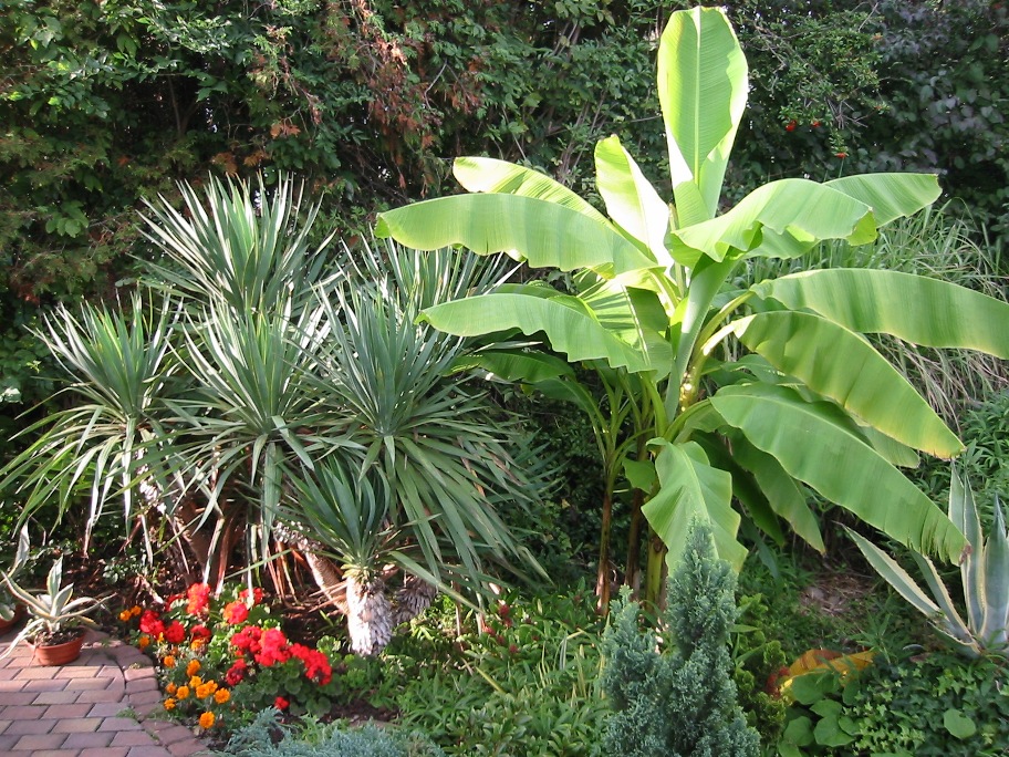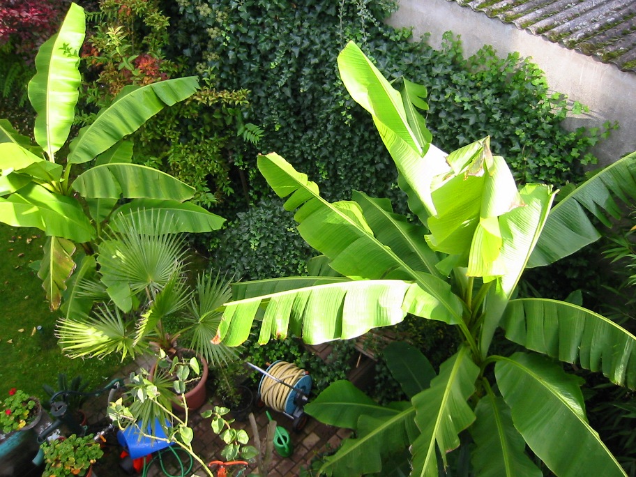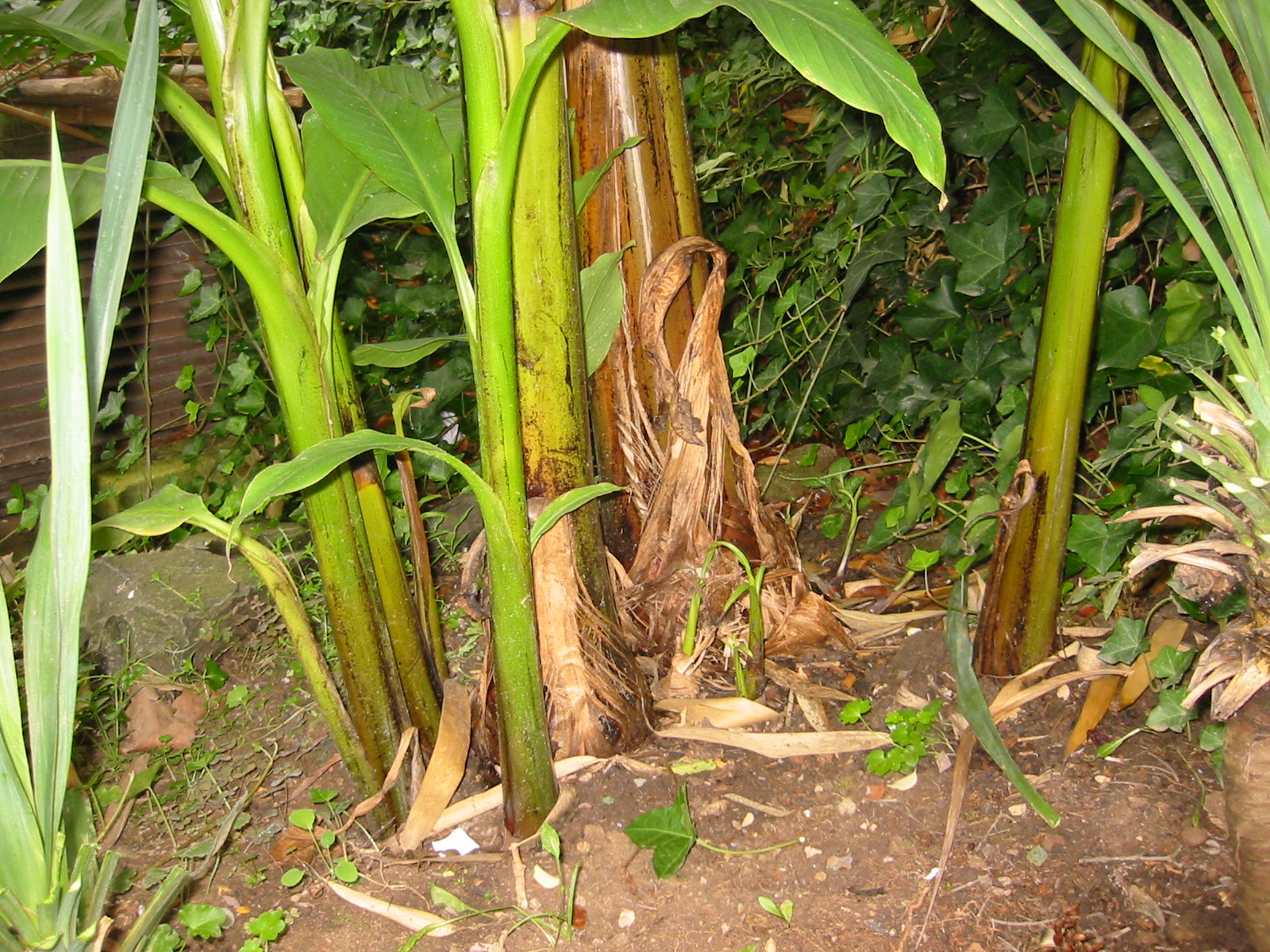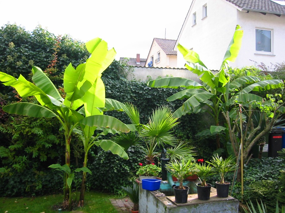 Eine unversehrte sehr schöne (3 jährige)Basjoogruppe, die windgeschützt steht , aber durch „Wurzelkonkurrenz“ von Zwergbambus ?nicht so richtig groß wird.
