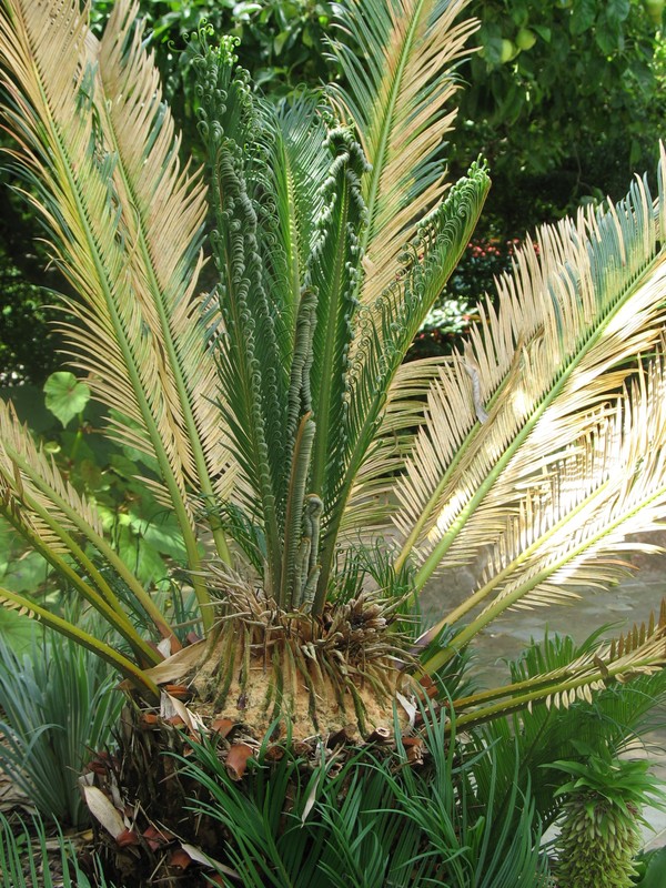 der Neutrieb meiner Cycas revoluta nach Winterschaden und Zapfen. Ganz untypisch: kein Trichterwedel, sondern lantgsam Blatt nach Blatt, bisher allenfalls ein einseitiger Trichterrand. Aber da scheint noch einiges im Vegetationspunkt zu stecken