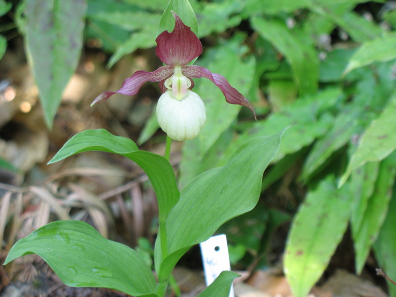 hier hatte ich noch gar keine Blüte erwartet. Eine Neuerwerbung von der Raritätenbörse im Palmengarten Frankfurt von diesem März. War ein streichholzstarker Winzling in in ein ebenso winzigen Topf: Cypripedium manschuricum steht auf dem Etikett. Ich bin mir nicht sicher. Auf Fotos ist diese Art etwas anders gefärbt, soll aber sehr variabel sein.