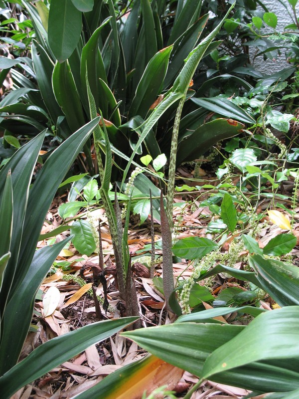 auch Sauromatum venosum legt am warmen halbschattigen Standort zu. Nach mehreren Blütenständen (einer im letzten Jahr) erscheinen nun die Blätter.