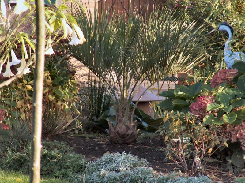 diese ausgepflanzte Jubea habe ich heute entdeckt. Ob und wie sie geschützt wird konnte ich nicht erfahren da der Besitzer nicht zu erreichen war. Neben der Jubea wachsen auch noch einige Musa basjoo und Trachys in dem Garten.