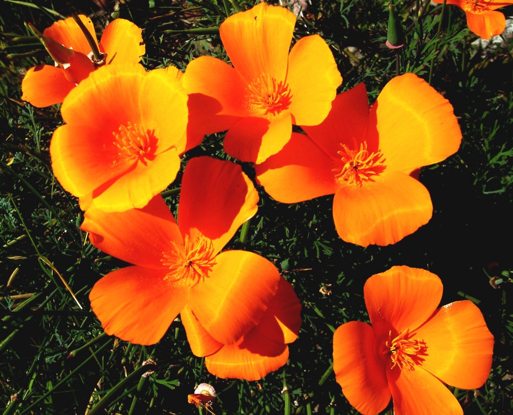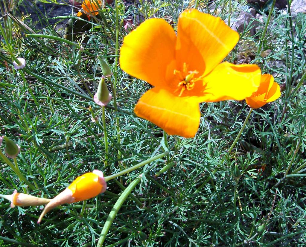 Der Goldmohn oder auch "Schlafmützchen" genannt - /*Eschscholzia californica Cham. */ - die Staatsblume Kaliforniens, blüht ja unermüdlich, von April, wenn das Wetter mitspielt auch bis Weihnachten. Allerdings hat man sein zu tun, ihn im Zaum zu halten, starke Selbstaussaat und er wird auch etwas struppelig. Bei mir wächt er ausdauernd, mit meterlangen korkigen Wurzelstrünken. So ist er früh blühbereit und das Leuchtende Goldorange bis Gelb mit orange Mitte ist unvergleichlich. Doch noch schnell mal ein paar Fotos: