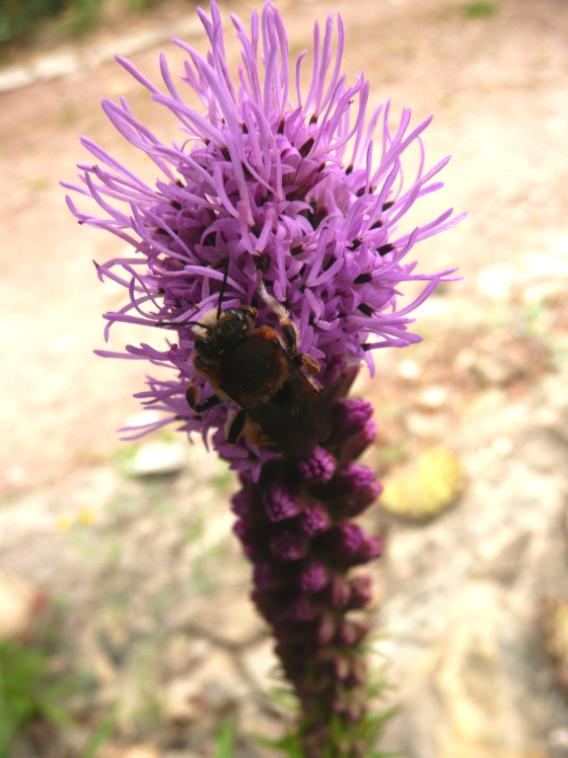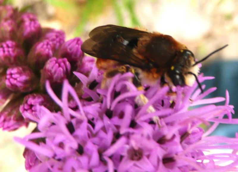 Hallo hier auf der /*Liatris elegans*/ hätte ich erst für ne Biene oder Hummel gehalten - aber die haben ja eher (ihrem Namen nach) Hummeln im Arsch und sitzen nicht ewig aauf der Blüte rum. Ddie 'Biene', wenn's denn eine ist, war leider etwas zu shattig, hatte aber dann doch die Flucht ergriffen: