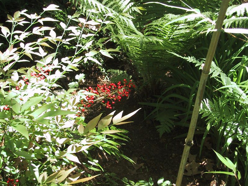 Hier in einer dunklen Farnecke - wo sie sich offensichtl. wohl fühlt!- der "Heilige Bambus" der Japaner (seit Jahren ausgepflanzt, ohne Schaden)