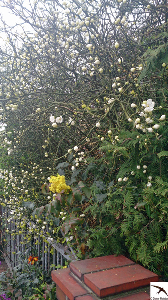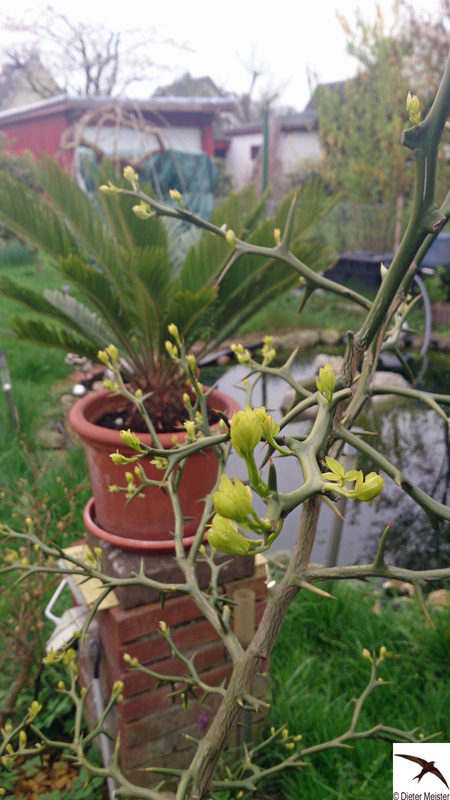 ich hatte schon mehrmals die Hecke der Dreiblättrigen Bitteorange gezeigt,dort wo die Spatzen alle im Chor zwitschern.