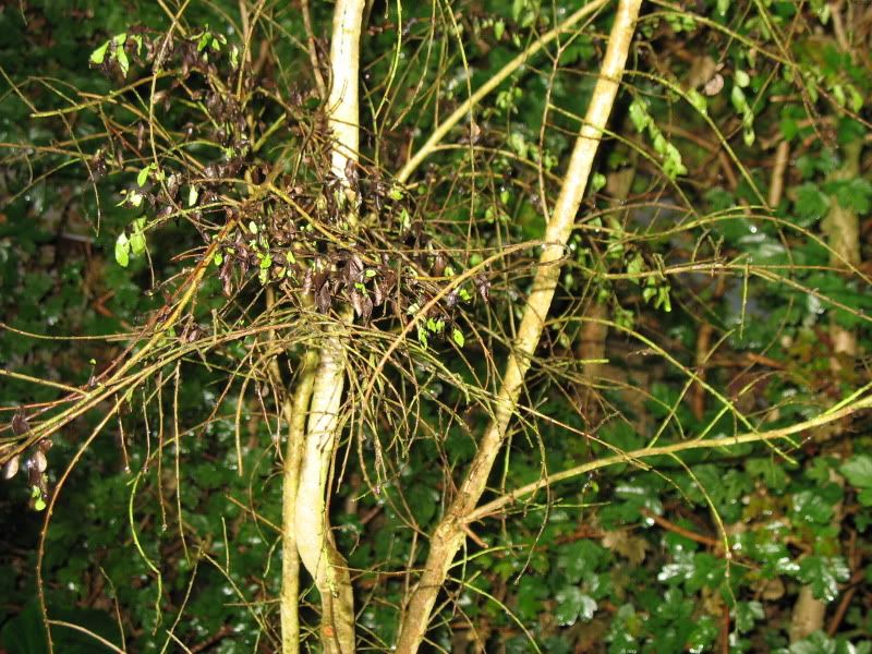 Meine 3 m hohe Azara microphylla, nach dem Winter schwarzgrün, hatte zunächst bis in die Spitzen grüne Blätter gebracht, doch jetzt mitten im Sommer ist sie nun kollabiert. Ein Foto von letzter Woche! Inzwischen oben ganz kahl.