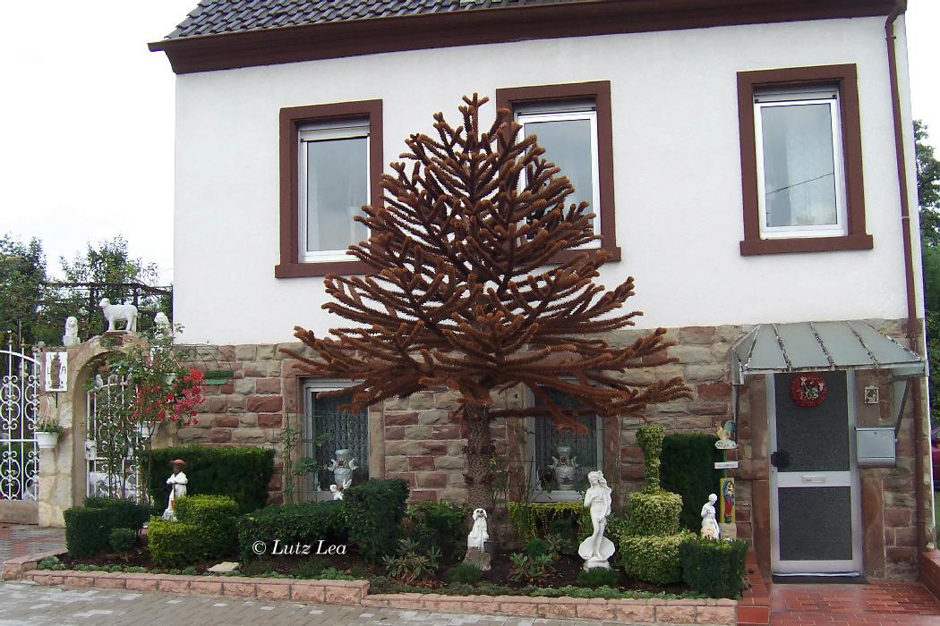 als ich am Montag von "Blumen-Carroccia" in Kleinblittersdorf-Sitterswald auf der Rückfahrt entlang der Saar zum Flughafen Saarbrücken war, kam ich an dieser leider total braun gewordenen chilenischen 'Araukaria araucana' vorbei.