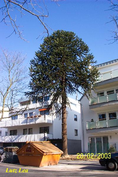 heute wollte ich es mal wissen und habe die tolle 1a Araucarie (Chilenische Schmucktanne) vermessen, um genauere Daten und Fakten zu erhalten. Jene gedeiht in Bonn-Beuel, in der Elsa-Brändstöm-Straße 23, vor einem Neubau im Vorgärtchen. Ich hatte Foto (leider sehr trübe), Maßband und Klinometer (Höhenmessgerät) dabei.