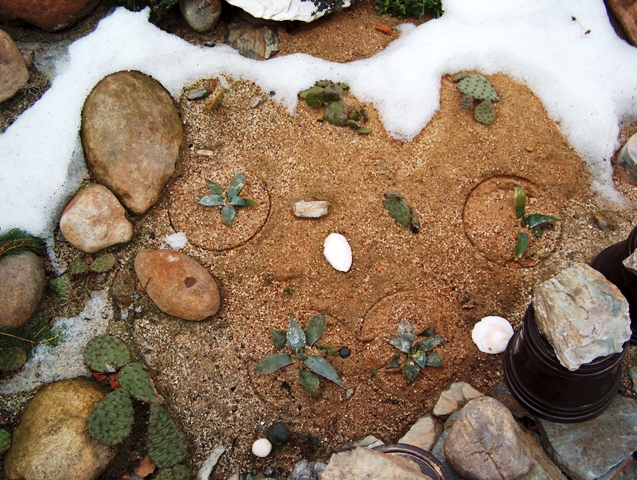 Hier nun die Bilder. Agave parryi var. parryi hat die meisten äußeren Blätter erfroren. Sind Matsch trotz Regenschutz. Das Sandbeet verwandelte sich durch den Bodenfrost in ein Moorbeet:
