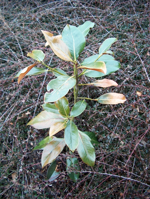 Magnolia grandiflora hats ohne Schutz ganz gut überstanden. Gepflanzt im Sommer 2005.