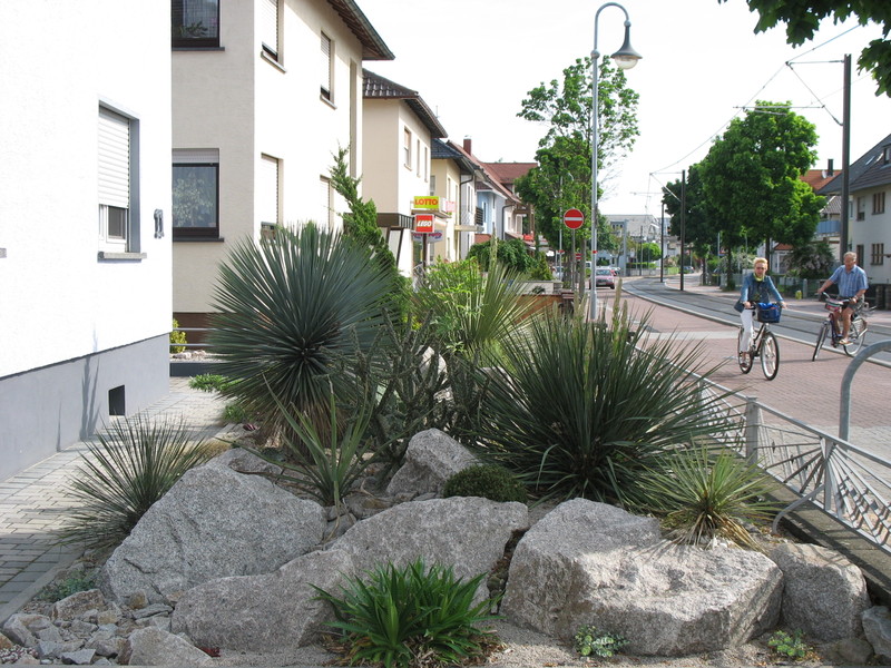 auch in diesem beriets früher gezeigten Vorgarten erreicht die Entwicklung jetzt ordentliche Dimensionen. Die meisten Yuccas wurden im Oktober 2003 im "Grasstadium" gepflanzt.