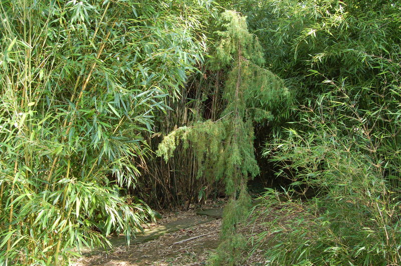 /*Juniperus communis Horstmann*/ eine interessante Trauerform unseres einheim. Wacholders zwischen Phyllostachys aureosulcata aureocaulis und Fargesia rufa