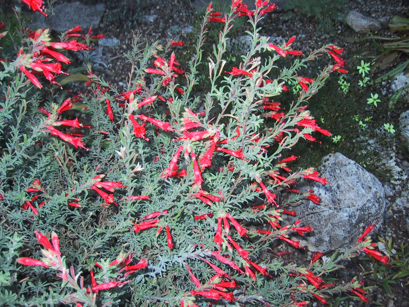 Ein absoluter Hingucker (nach unten) = HIGUNAU, die californ. Kolibritrompete /*Zauschneria californica*/, leider war die Aufnahme nur mit Blitz möglich (wir hatten einfach die Zeit "vergessen")