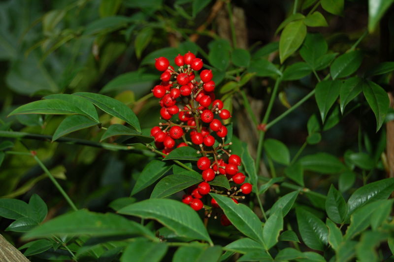/*Nandina domestica*/ behält ihre sattgrüne Blattfarbe v.a. im Schatten. Der Sonne ausgesetzt verfärben sich die Blätter ins Rötliche