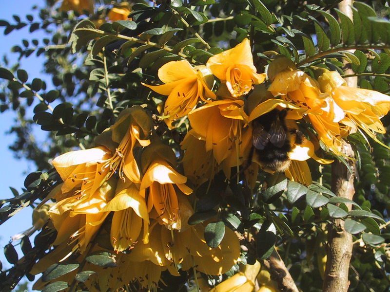 steht auch bei mir seit Jahren im Garten ausgepflanzt, allerdings kommt die Blüte deutlich später!(/*Sophora microphylla*)