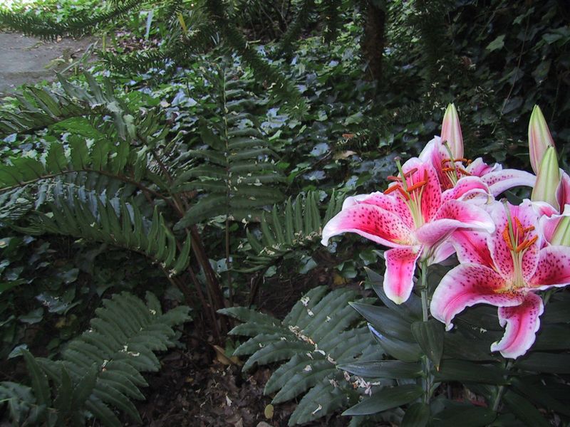 Lilienhybride neben Blechnum chilense