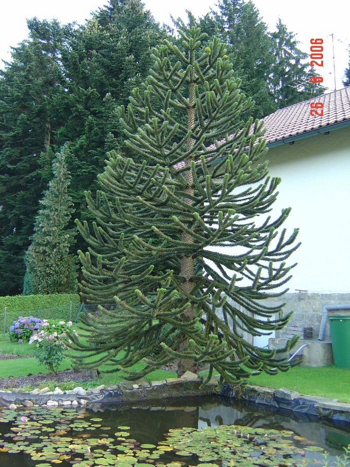 Die Höhe der Araucaria araucana schätze ich auf ca. 10m. Der Stamm ist schon gewaltig, kommt bei dem Foto nicht so richtig rüber.