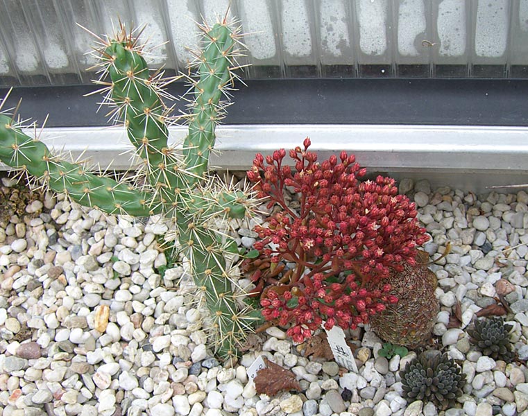 /*Sinocrassula yunnanensis*/ friert im winter immer etwas zurück aber kommt jedes Jahr wieder, daneben junge opuntia imbr.