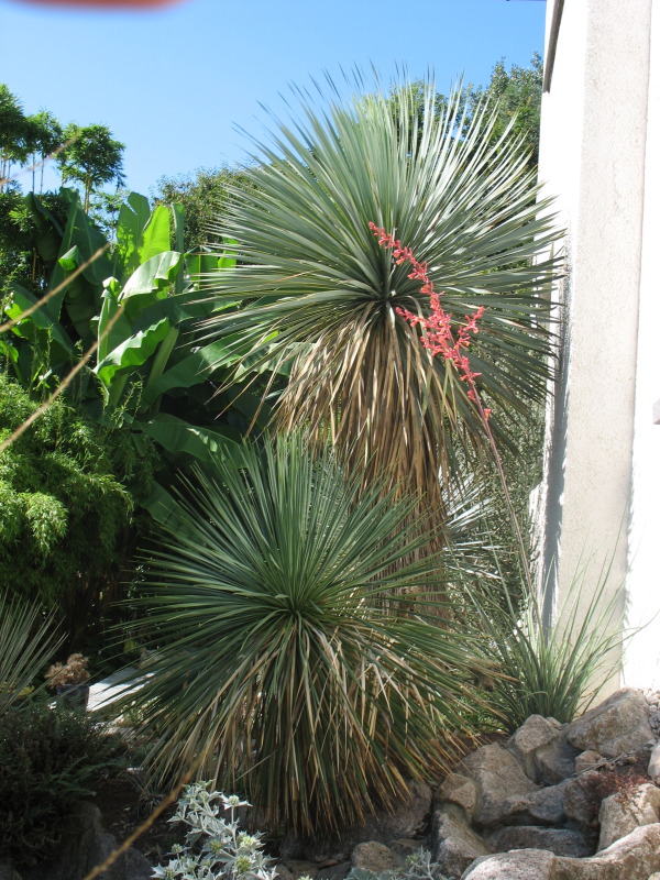 Hesperaloe parviflora kann endlich durchatmen und dankt mit einer Blüte. Zuvor wurde sie total unter der kapitalen Cylindropuntia imbricata begraben, welche ziemlich überraschend letzten Winter einging. War durch die eingetretene Enge im Xerophytenbeet auch besser so