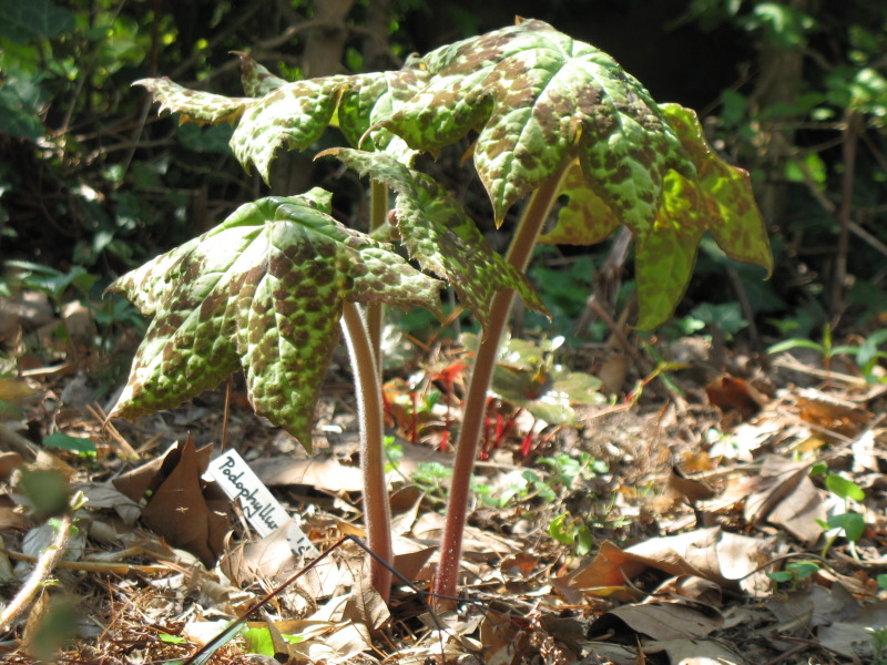 Podophyllum 'Spotti Dotty', während P. 'Kaleidoscope' nicht wirklich in die Gänge kommen will