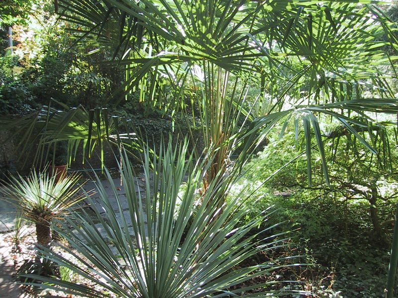 Die schönsten Herbstfarben kommen allerdings erst Mitte Oktober.Da das Herbstlicht selbst mittags eher von der Seite kommt,sind v.a. Gegenlichtaufnahmen interessant u. wirken völlig anders als im Hochsommer(s.Anlage:Yucca rostrata,rigida u. Trachycarpus)