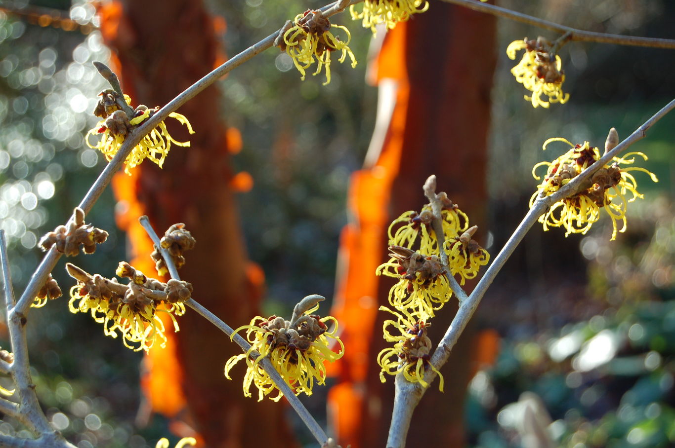 /*Hamamelis mollis*/ vor Acer griseum-Stamm, einem Feuerwerk nicht unähnlich