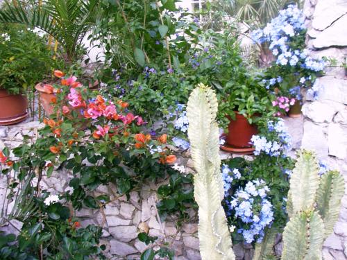 Hier ,leider etwas zu weit weg,das Farbespiel von Plumbago,Solanum blau Bougainvillea,undJasminum Sambac