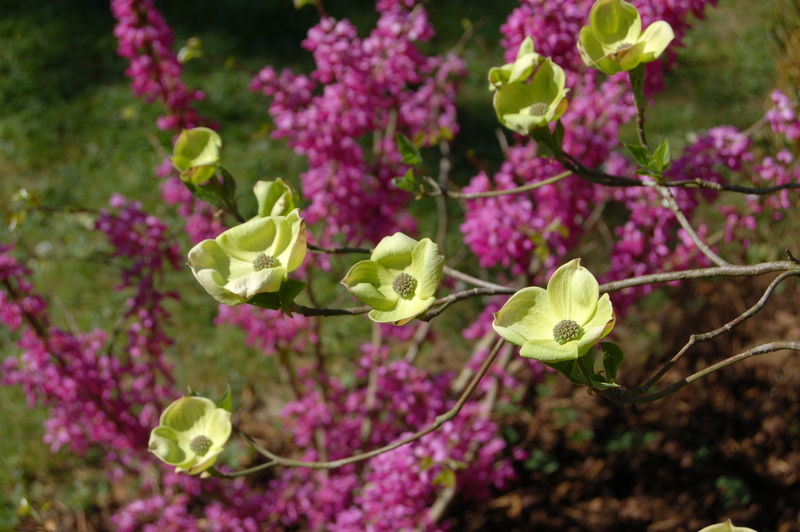 In den ersten Tagen der Blüte (doppelt so groß wie Cornus florida)erscheint die Blüte von /*Cornus nuttallii Eddies White Wonder'*/fast zitronengelb, später wird sie dann schnneweiß. Hier steht sie vor Cercis chinensis Avondale