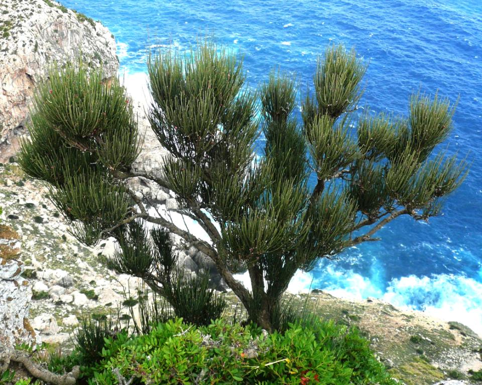 Könnte sein Dass Du diese imposanten Meerträubel-Exemplare hier auch schon mal gezeigt hast, die westmediterrane /*Ephedra fragilis ssp. fragilis*/ auf dem ersten Foto hinter einem polsterförmig wachsenden Mastixstrauch /*Pistacia lentiscus*/, auf dem zweiten oben links mit der Balearen-Stechwinde /*Smilax aspera var. balearica*/: