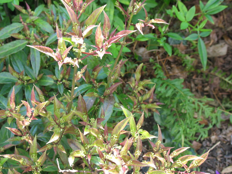 noch dazu winzig klein, sind die Blüten von Helwingia japonica. Sie erscheinen großteils mitten auf dem Blatt, ähnlich wie von Ruscus bekannt.