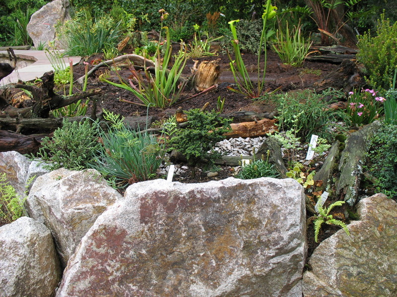Vorpflanzung außerhalb des Hochmoorbeetes auf etwa einen halben qm Fläche. Von links nach rechts: Woodsia obtusa, Helichrysum selago var. tumidum, Allium scenescens ssp. glaucum, Mildella fallax, Ulmus parviflora 'Hokkaido', Plantago x schrenkii, Woodsia polystichoides, Pellea cordifolia, Microstrobus fitzgeraldii, Rhodohypoxis bauri, Jasminum parkeri, Sisyrinchium califoricum, Cassinia vauvilliersii.