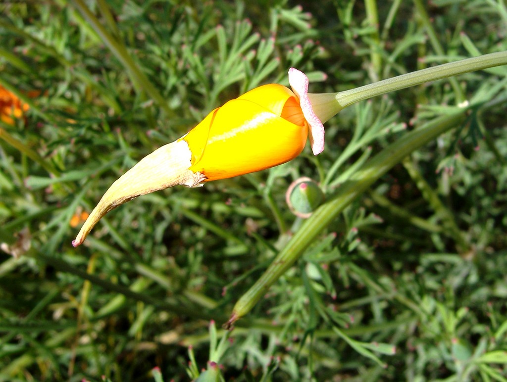 Der Goldmohn oder auch "Schlafmützchen" genannt - /*Eschscholzia californica Cham. */ - die Staatsblume Kaliforniens, blüht ja unermüdlich, von April, wenn das Wetter mitspielt auch bis Weihnachten. Allerdings hat man sein zu tun, ihn im Zaum zu halten, starke Selbstaussaat und er wird auch etwas struppelig. Bei mir wächt er ausdauernd, mit meterlangen korkigen Wurzelstrünken. So ist er früh blühbereit und das Leuchtende Goldorange bis Gelb mit orange Mitte ist unvergleichlich. Doch noch schnell mal ein paar Fotos: