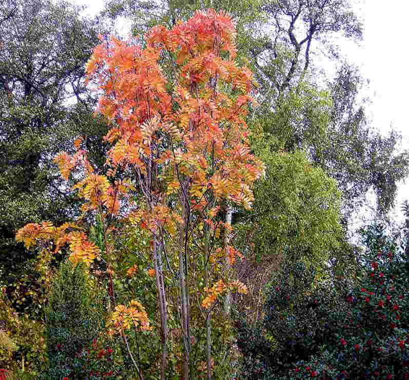 obwohl wieder bedeckter Himmel mit Totensonntag-Stimmung hier waltet, habe ich dennoch versucht, etwas von der unvergleichlichen Herbstfaerbung der /*Sorbus hupehensis*/ (aus der Provinz Hupeh in China) festzuhalten. Vorerst ist hier keine Sonne mehr zu erwarten, so dass vorlauefing und vielleicht ueberhaupt 2006 nicht mehr bessere Bilder moeglich sind.