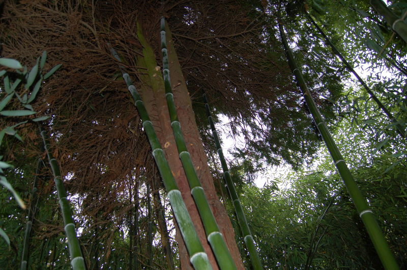 in eine Thuja plicata hineinwachsend (als ob sie von diesem Baum magisch angezogen werden würden) die Halme von /*Phyllostachys vivax*/. Mittlerweile ca 10m hoch!!
