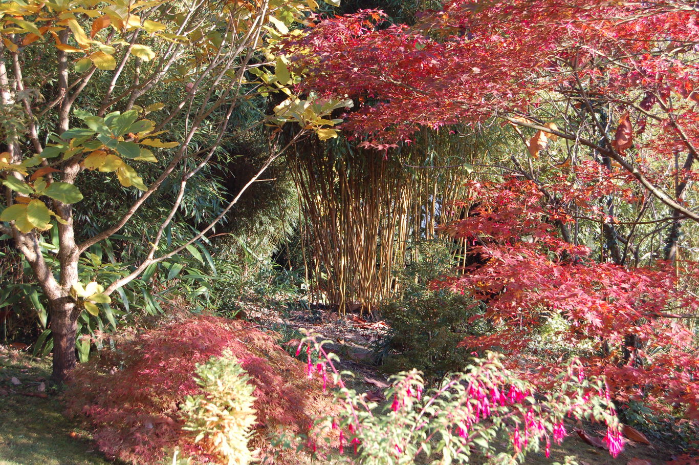 gelbgrüne /*Quercus pontica*/ li,intensiv gelber Phyllostachys aureosulcata Aureocaulis mittig und re roter Acer palmatum Atropurpureum und nicht zu vergessen vorne: /*Fuchsia megellanica*/