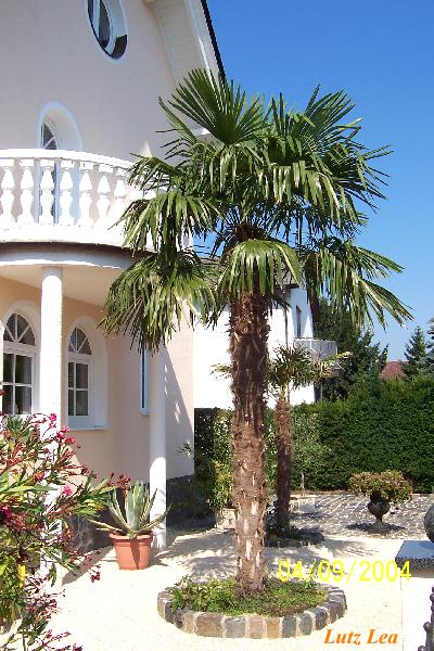 Das abgebildete Exemplar (Foto vom vorletzten Exotentreffen im August '04 in Mainz bei Bernhard) ist bereits ein Nachkömmling von den Palmen, die bis zum erwähnten "Eisereignis/Dachlawine" 1996/97 (Herzschaden) so toll alle Winter in Mainz überstanden - aber bitte lest dazu nochmal die Berichte und Anmerkungen von Bernhard weiter unten in den Meldungen!